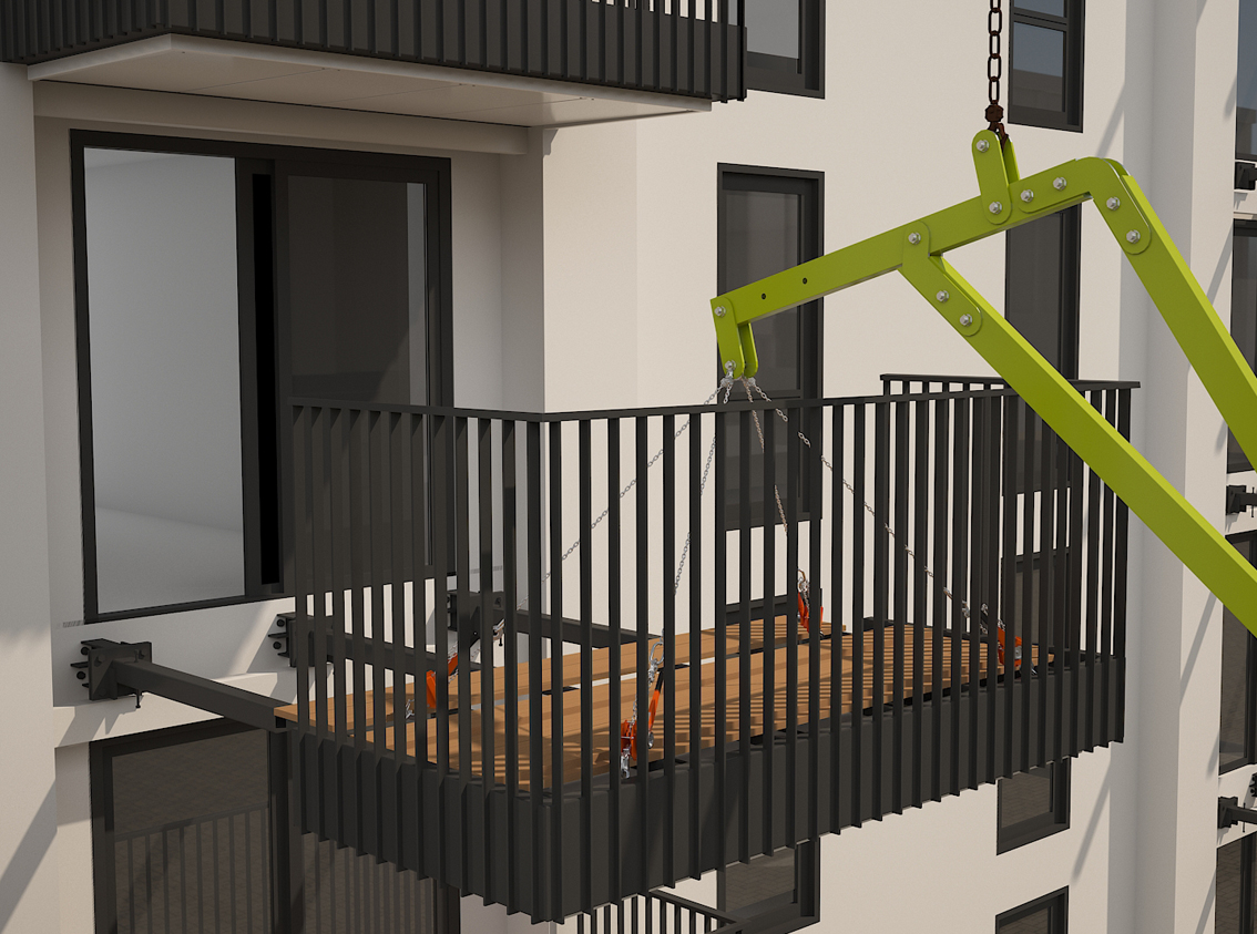 The lifting arm allows for flight deck balconies to be installed from top to bottom or from bottom to top. Depending on what suits the work programme.